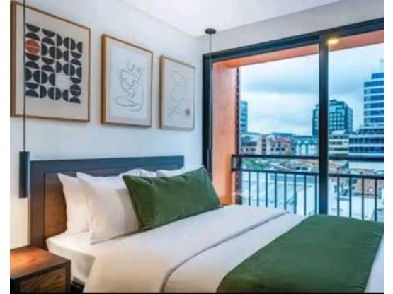 Es exterior, quinto piso, balcón, cama doble, cama sencilla, comedor 4 personas, escritorio, totalmente dotado línea blanca (Lavadora/secadora, nevera, horno microondas), 1 una ducha independiente del baño. Además, el edifico tiene excelentes amenities como co-working, sala de juntas, gimnasio, sauna, turco, salón de masajes, en el séptimo piso cuenta dos zonas BBQ, chimenea, club para pimpón y billar, yoga, y en la cubierta noveno piso tiene golfito, pista para correr, 2 zonas BBQ, chimenea, Jacuzzi, y en el primer piso esta la recepción, un café bar, 4 ascensores.